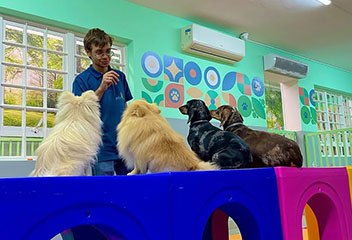 Além de creche e hotel para cachorro oferecemos várias atividades de gasto energético, interação com o ambiente, estimulação mental e sensorial para melhorar o comportamento e aprendizado.
